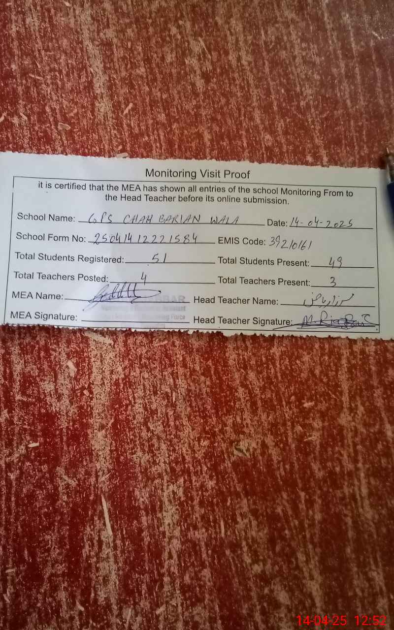 | EMIS Code: 39210161 | Name of School: GPS CHAH BARIAN WALA | |||