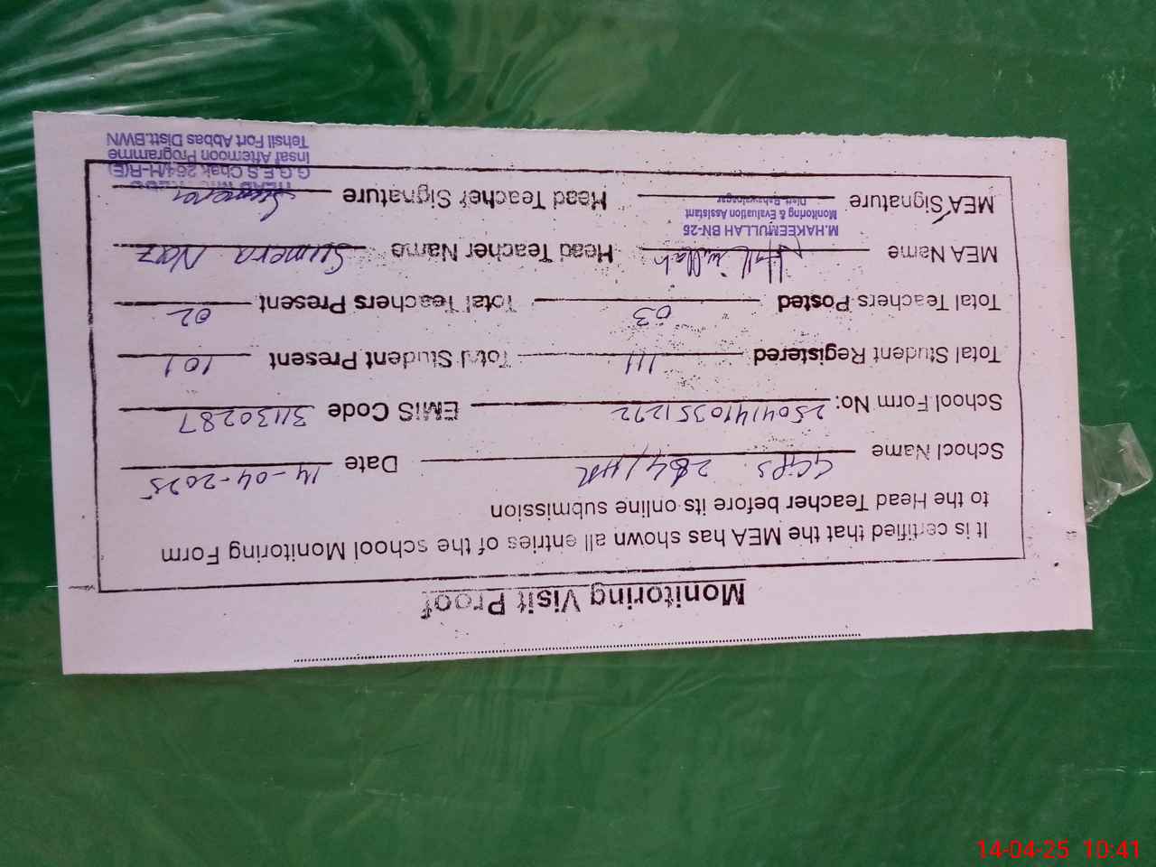 | Attendance Register | Head Teacher | MEA with School | Visit Proof |