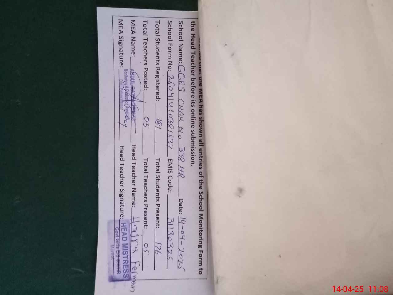 | EMIS Code: 31130325 | Name of School: GGES CHAK NO 338 HR | |||