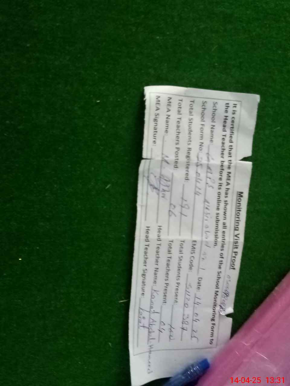 | Remarks (Use Separate Page if Required): NSB record not shown to mea and boundary wall of boys portion is not available and students attendance register are not updated | |||||