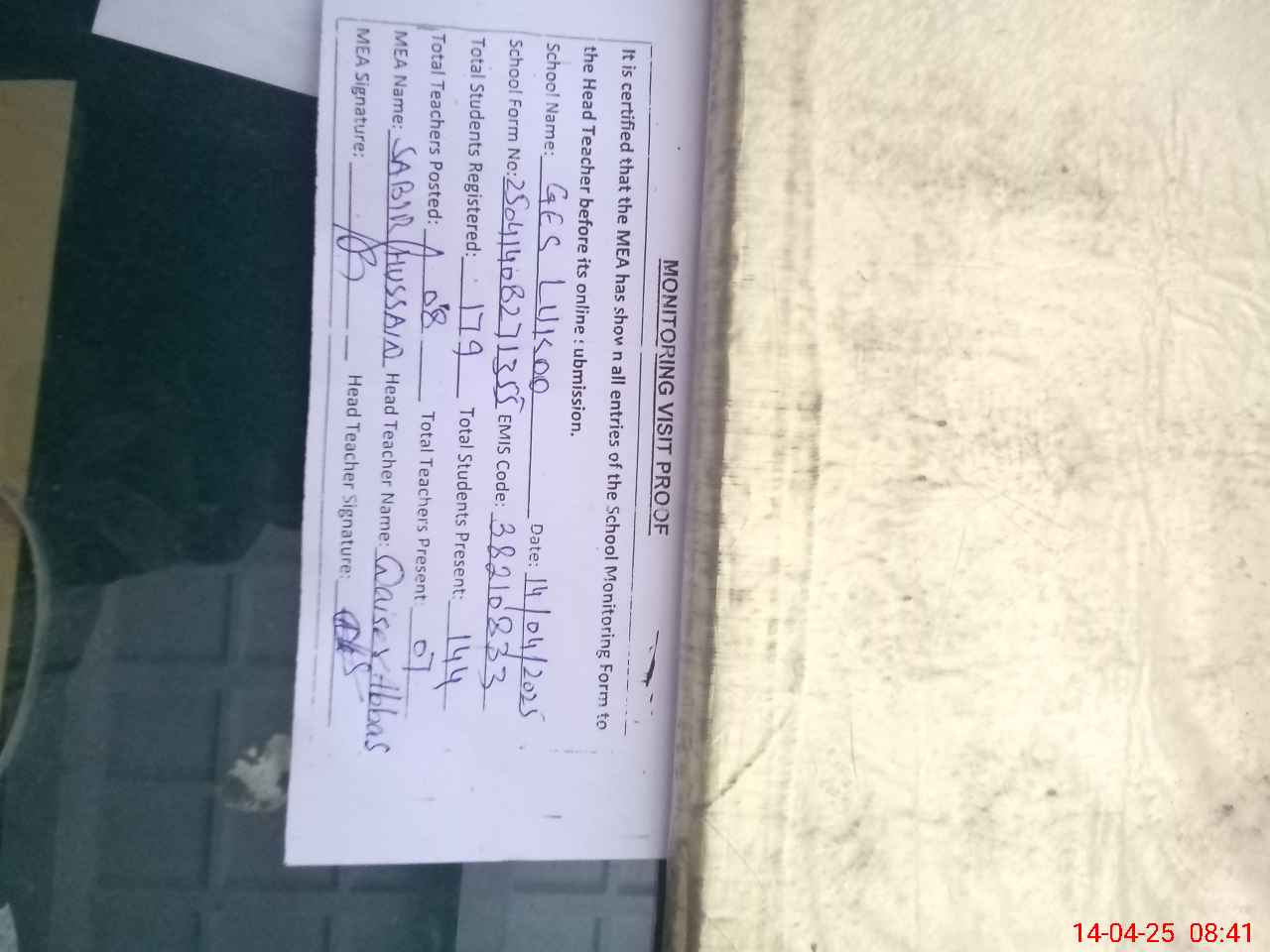 | Attendance Register | Head Teacher | MEA with School | Visit Proof |