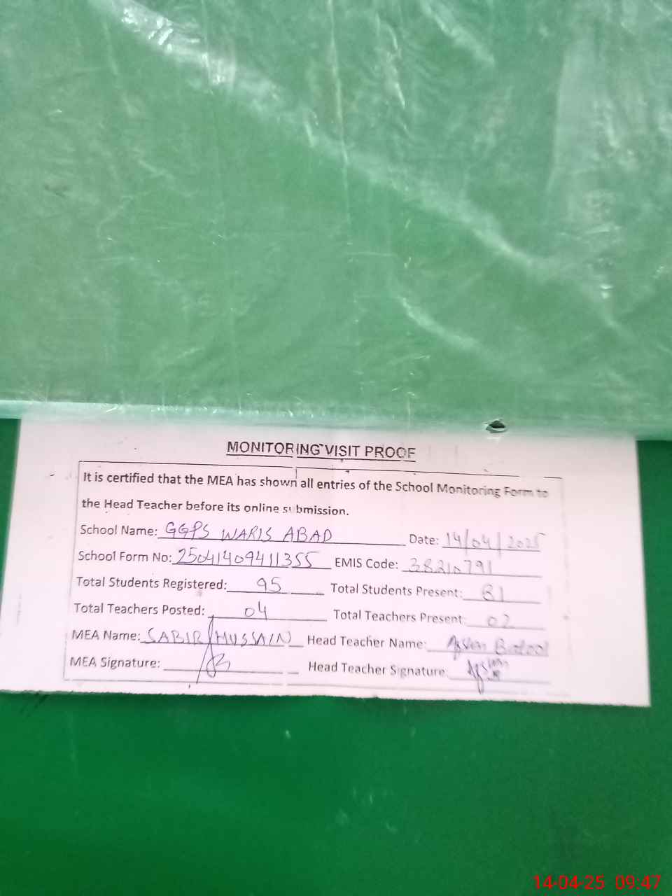 | Attendance Register | Head Teacher | MEA with School | Visit Proof |