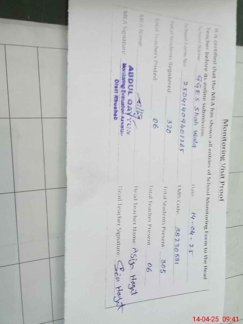 | Attendance Register | Head Teacher | MEA with School | Visit Proof |