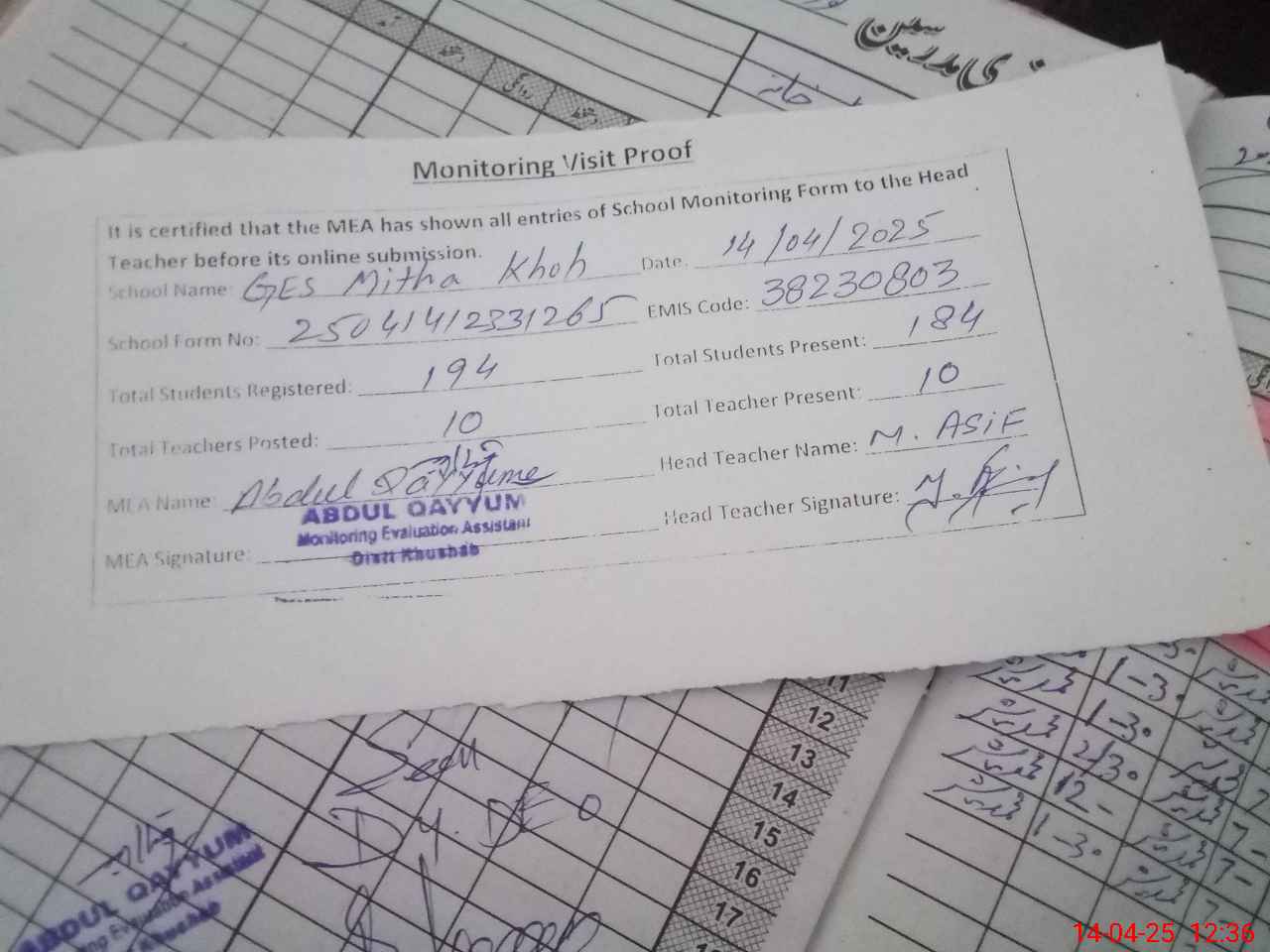 | Attendance Register | Head Teacher | MEA with School | Visit Proof |