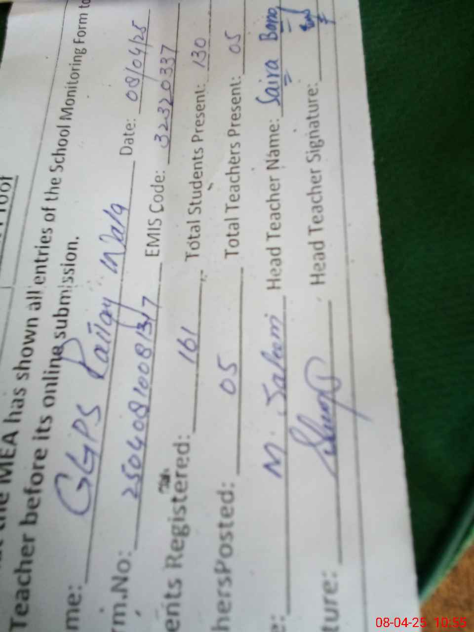 | Attendance Register | Head Teacher | MEA with School | Visit Proof |