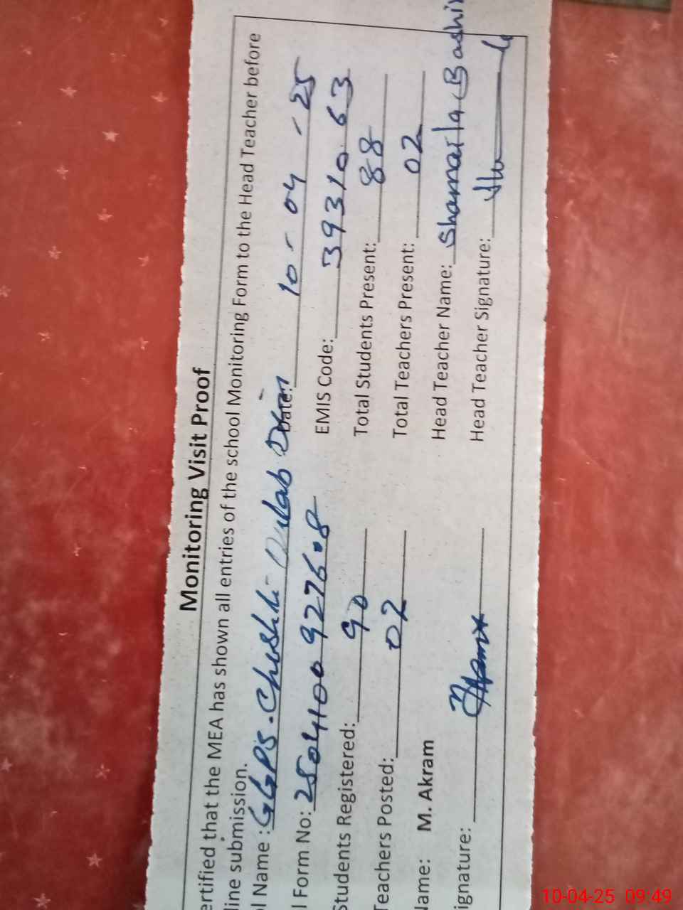 | Attendance Register | Head Teacher | MEA with School | Visit Proof |