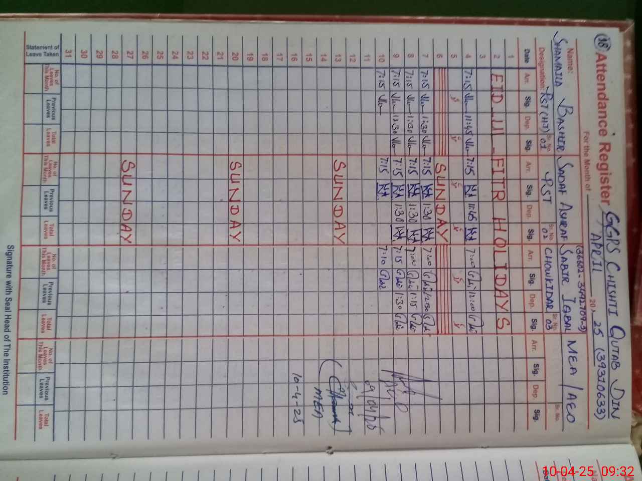 | Monitoring Date: 10-04-2025 | Start Time: 10-04-2025 09:27 AM | End Time: 10-04-2025 09:55 AM | Name of MEA: MU**** AK**** (R**** | |
