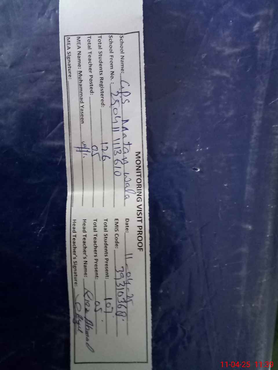 | Attendance Register | Head Teacher | MEA with School | Visit Proof |