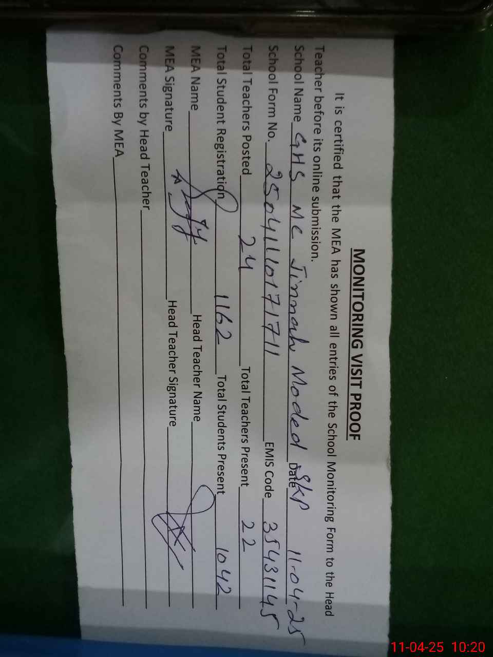 | Attendance Register | Head Teacher | MEA with School | Visit Proof |