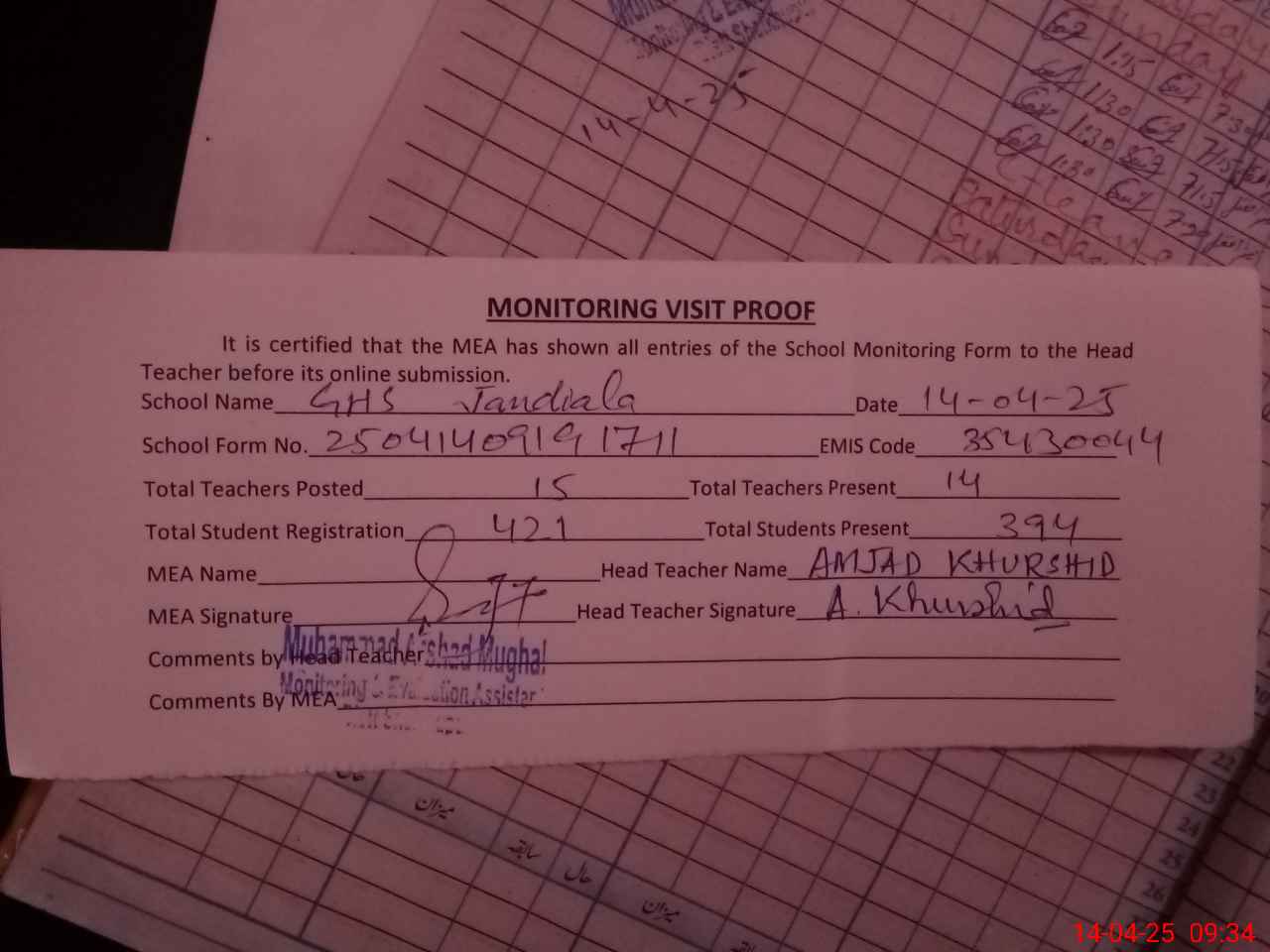 | Attendance Register | Head Teacher | MEA with School | Visit Proof |