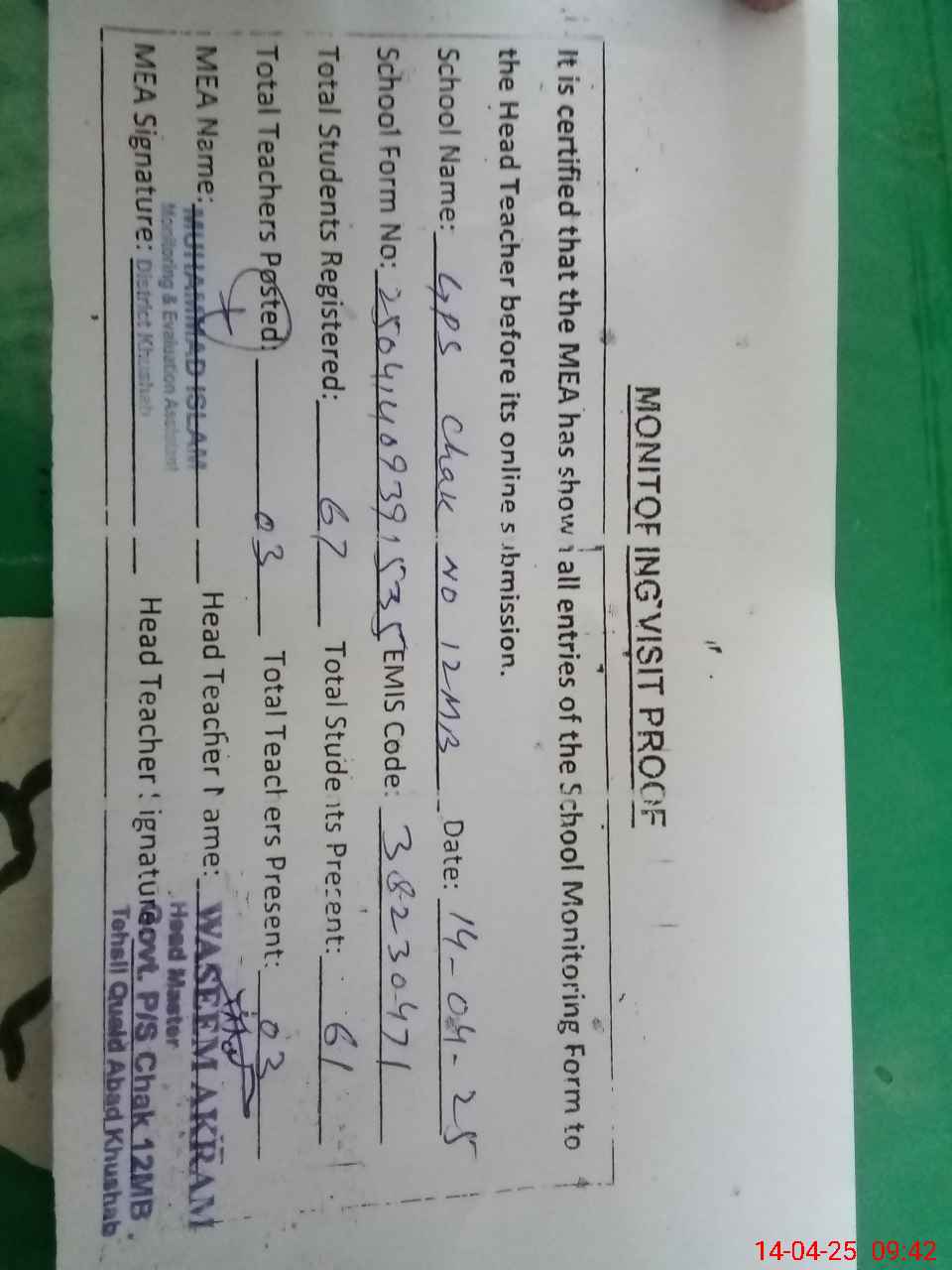 | EMIS Code: 38230471 | Name of School: GPS CHAK NO. 12 MB | |||