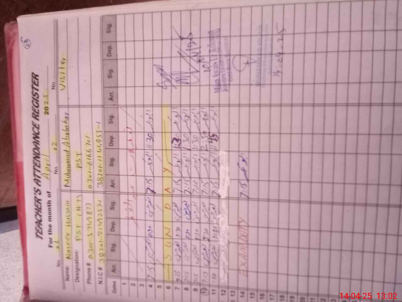 | CNIC | Full Name | Designation | R/C | Absence During Last Calender Month |