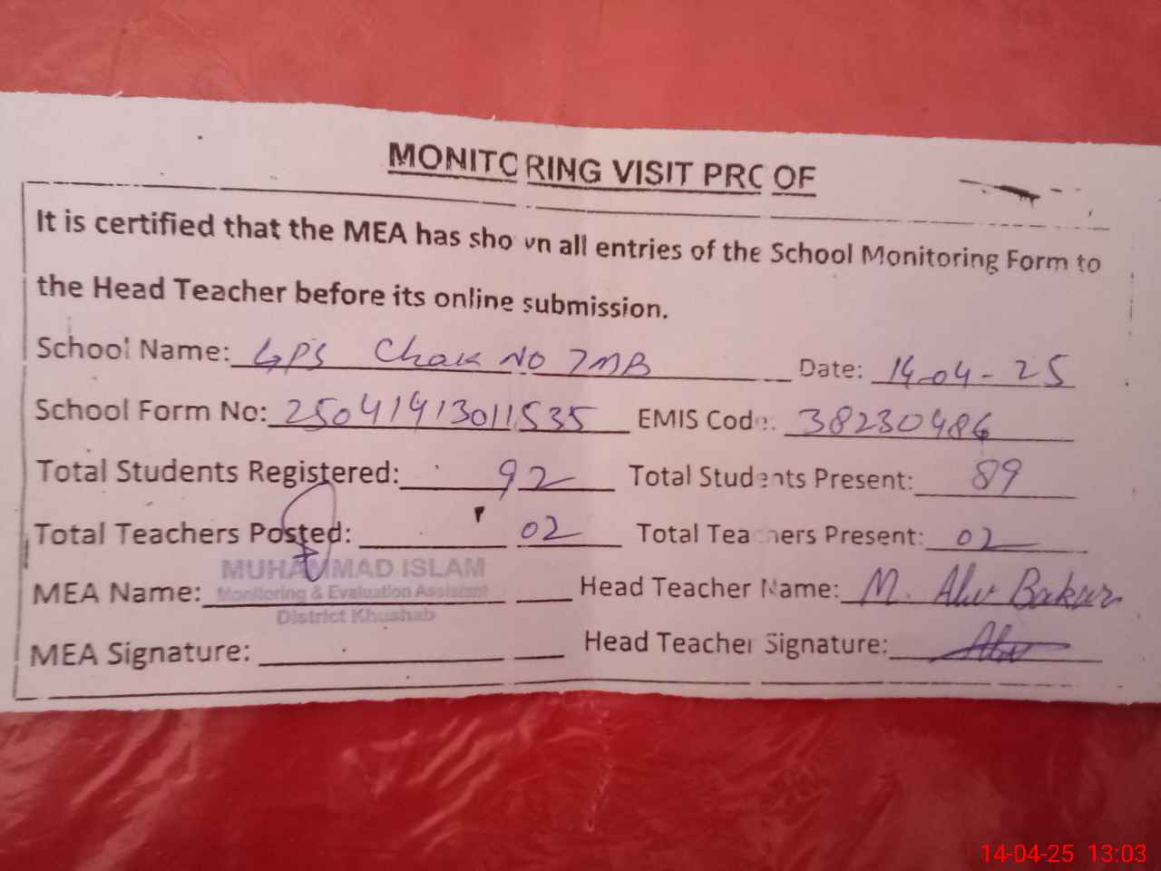 | Attendance Register | Head Teacher | MEA with School | Visit Proof |
