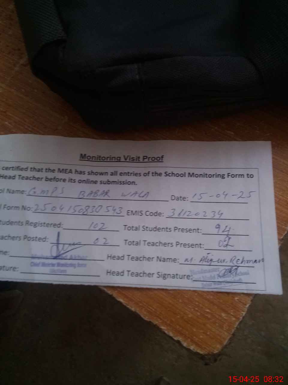 | EMIS Code: 36120234 | Name of School: GMPS BABAR WALA (KALO WALA) | |||