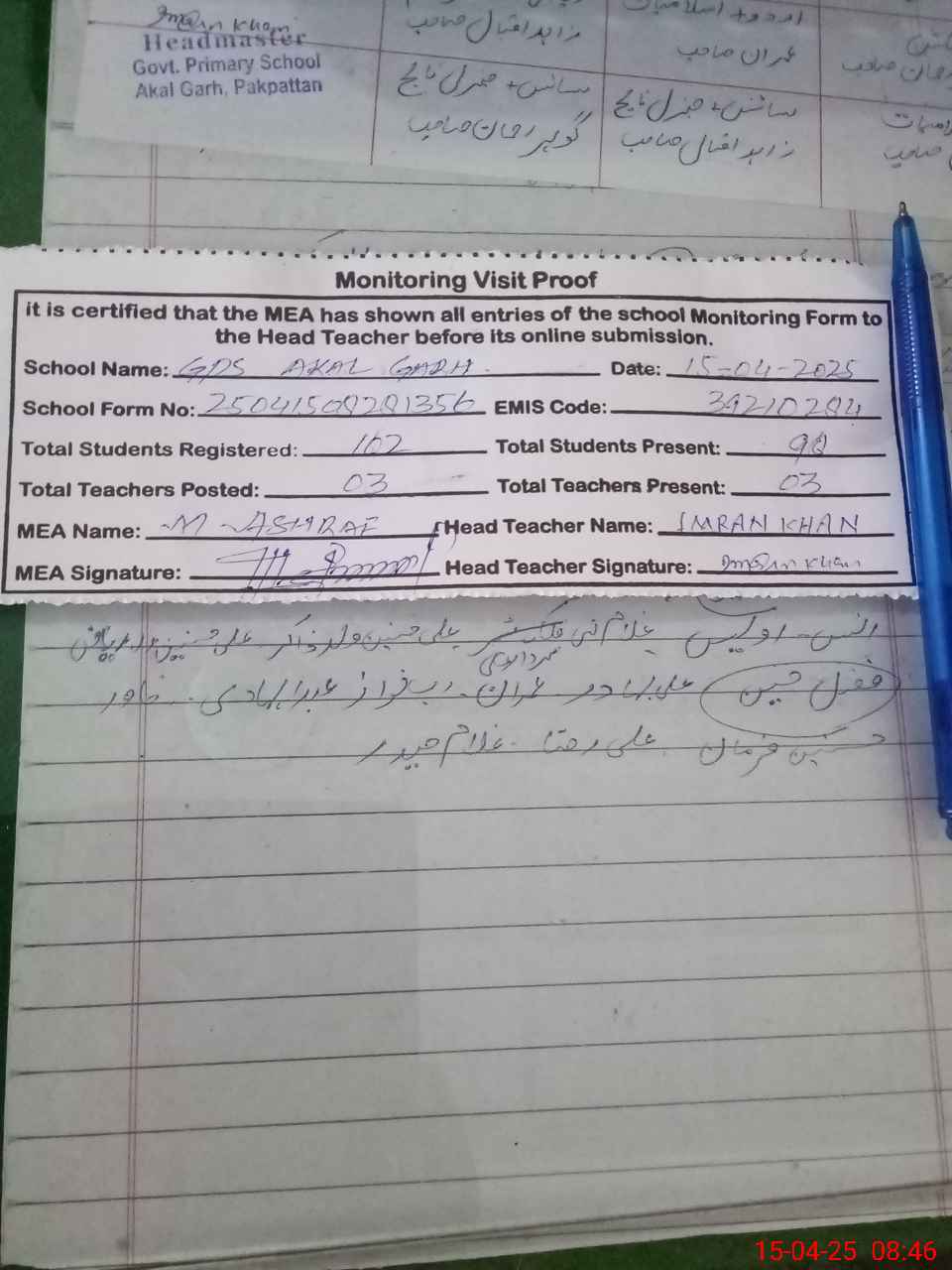 | Attendance Register | Head Teacher | MEA with School | Visit Proof |