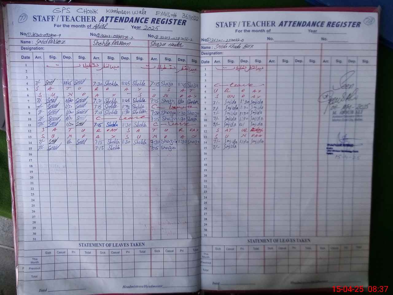 | Name: SA**** PE**** Designation: (School Headmaster's/Headmistress's) PST Phone/Cell Number: 03**** |