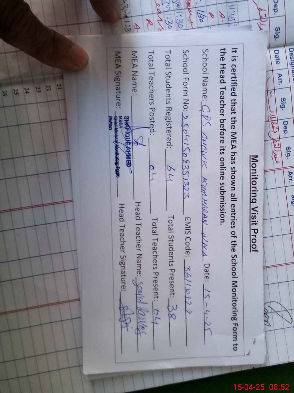 | Attendance Register | Head Teacher | MEA with School | Visit Proof |
