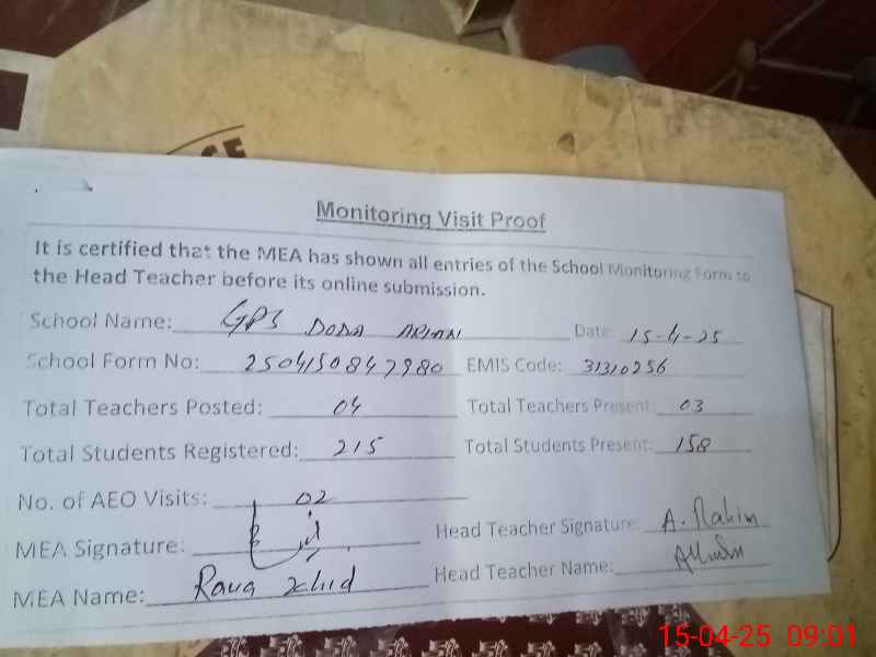 | EMIS Code: 31310256 | Name of School: GPS DODA ARAIN | |||