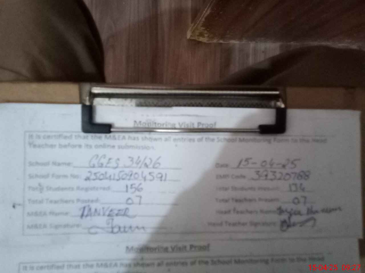 | Attendance Register | Head Teacher | MEA with School | Visit Proof |