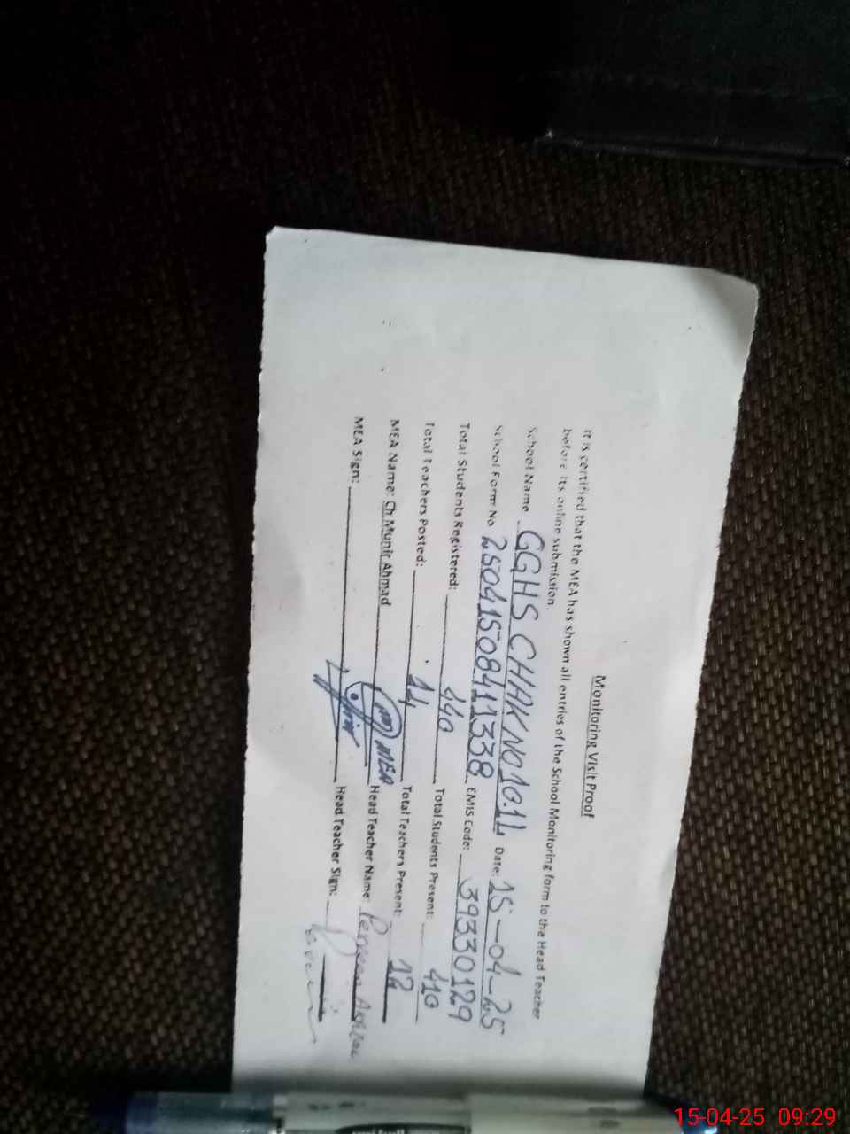 | Attendance Register | Head Teacher | MEA with School | Visit Proof |