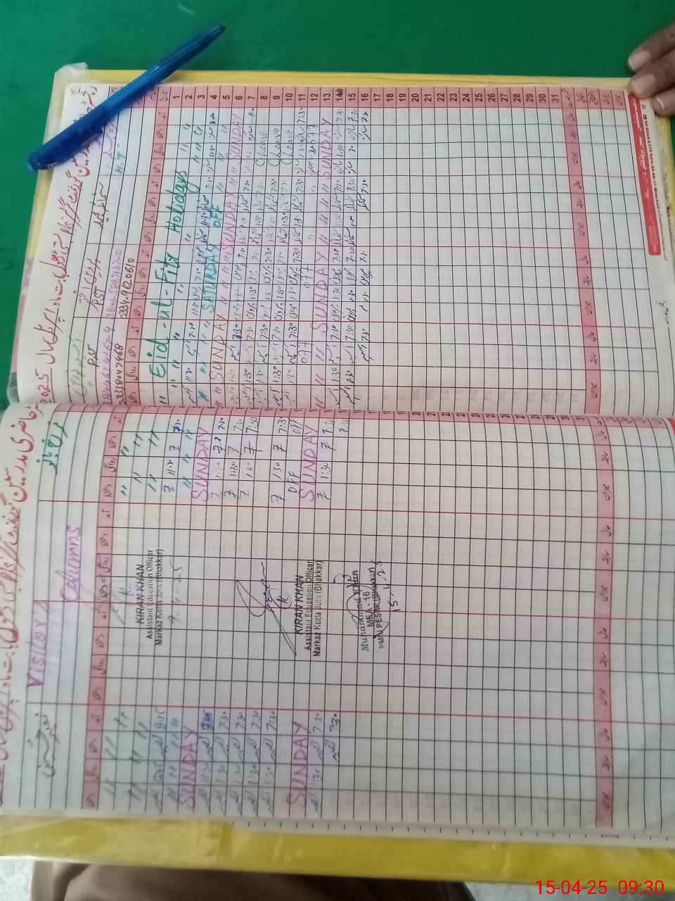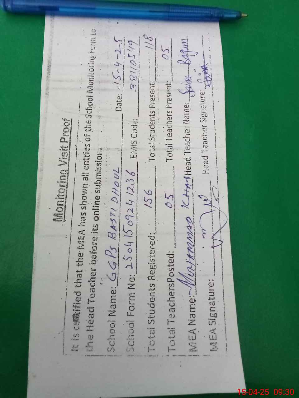 | Attendance Register | Head Teacher | MEA with School | Visit Proof |
