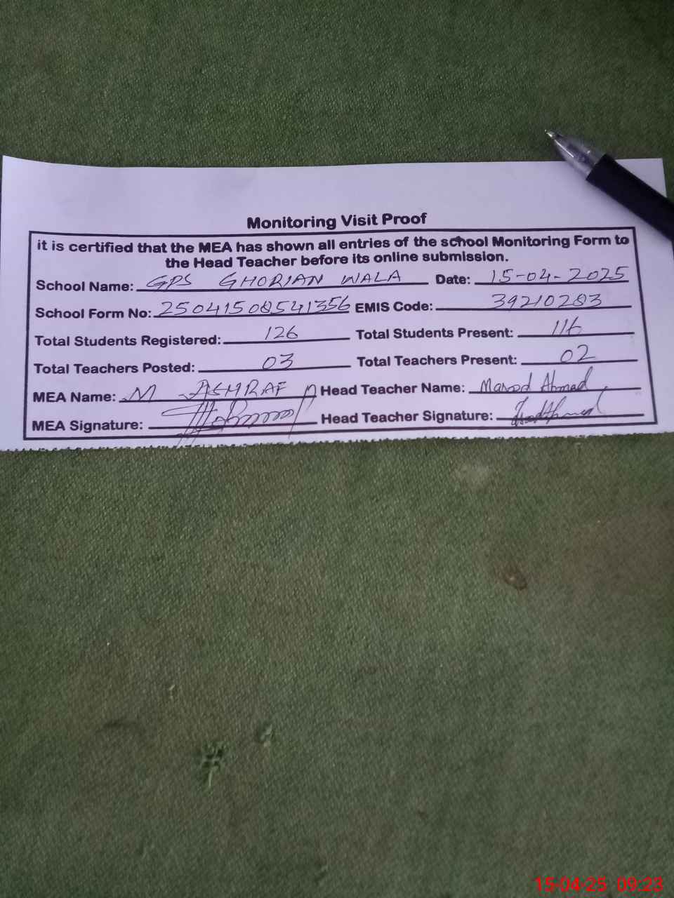 | Attendance Register | Head Teacher | MEA with School | Visit Proof |