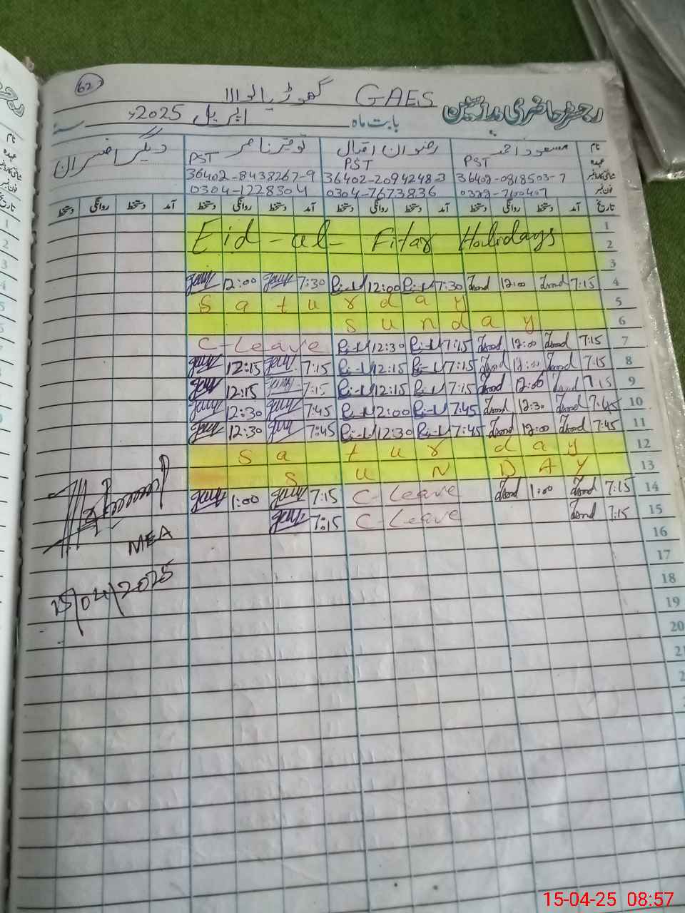 | Monitoring Date: 15-04-2025 | Start Time: 15-04-2025 08:54 AM | End Time: 15-04-2025 09:34 AM | Name of MEA: MU**** AS**** | |