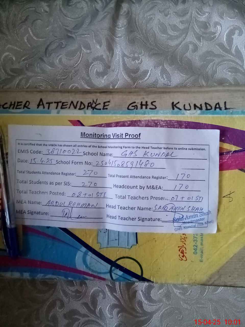 | Attendance Register | Head Teacher | MEA with School | Visit Proof |