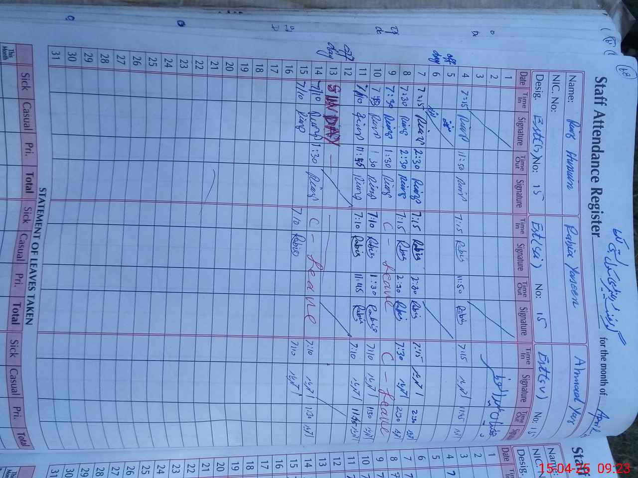 | CNIC | Full Name | Designation | R/C | Absence During Last Calender Month |