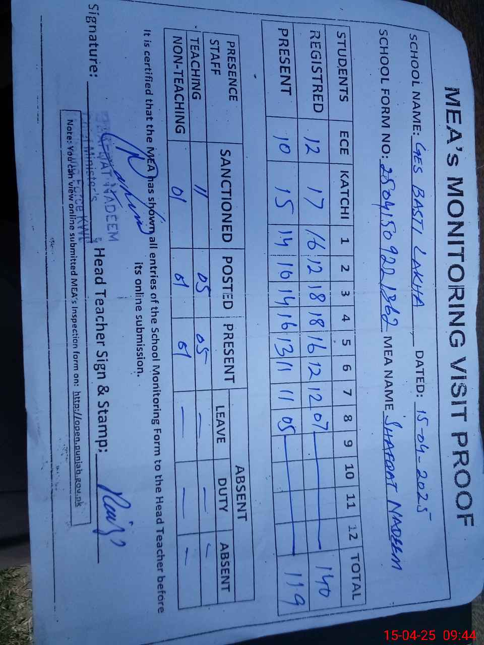 | Attendance Register | Head Teacher | MEA with School | Visit Proof |