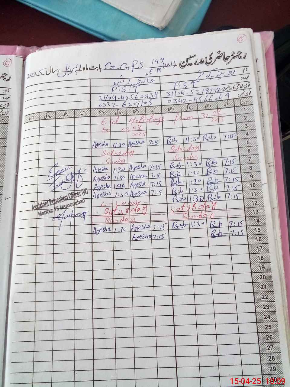 | Name: Ay**** Ra**** Designation: (School Headmaster's/Headmistress's) PST Phone/Cell Number: 03**** |