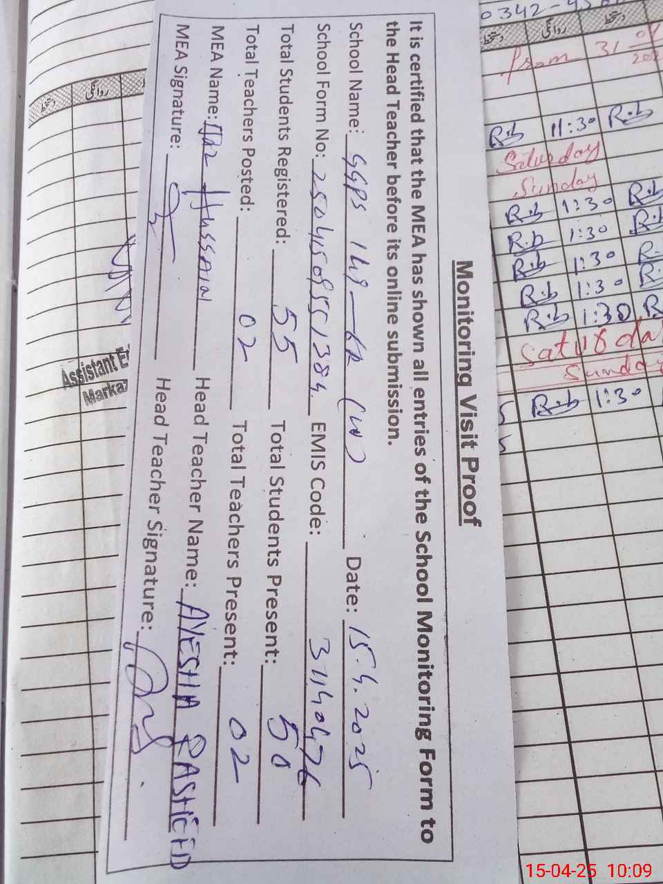 | Attendance Register | Head Teacher | MEA with School | Visit Proof |