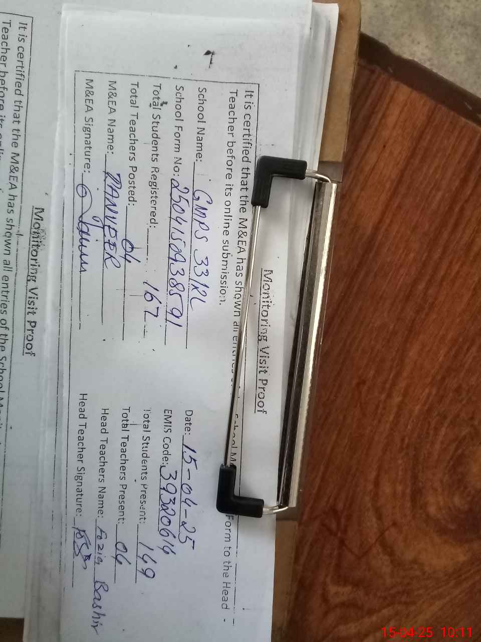 | Attendance Register | Head Teacher | MEA with School | Visit Proof |