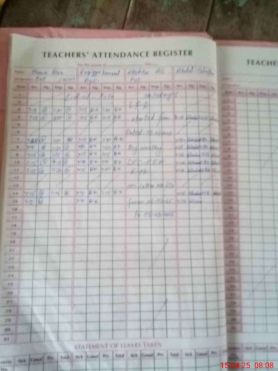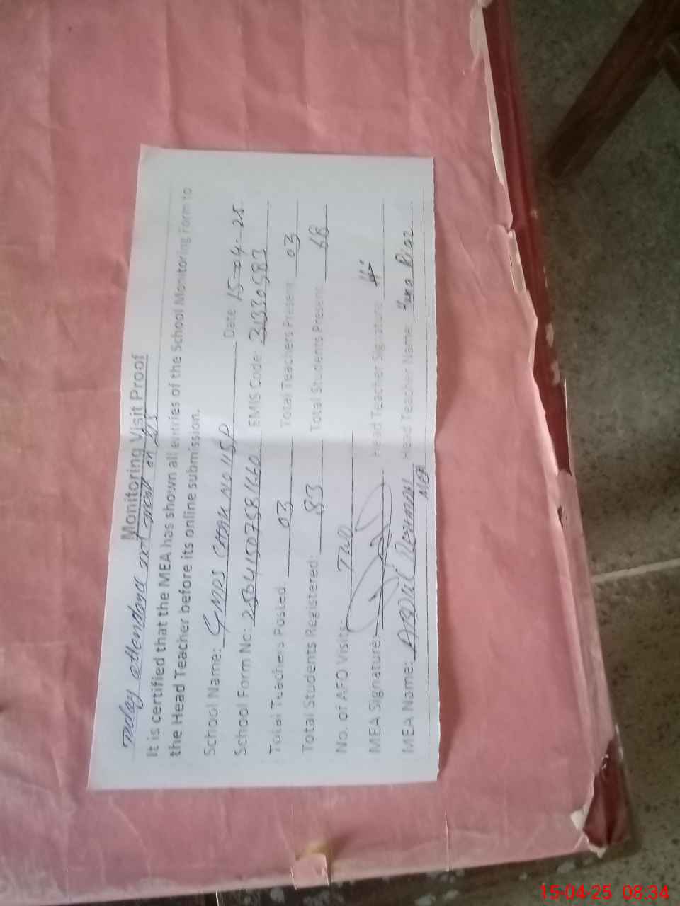 | Attendance Register | Head Teacher | MEA with School | Visit Proof |