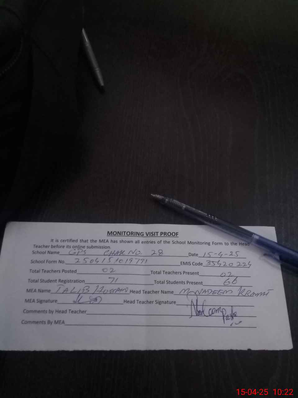 | Attendance Register | Head Teacher | MEA with School | Visit Proof |