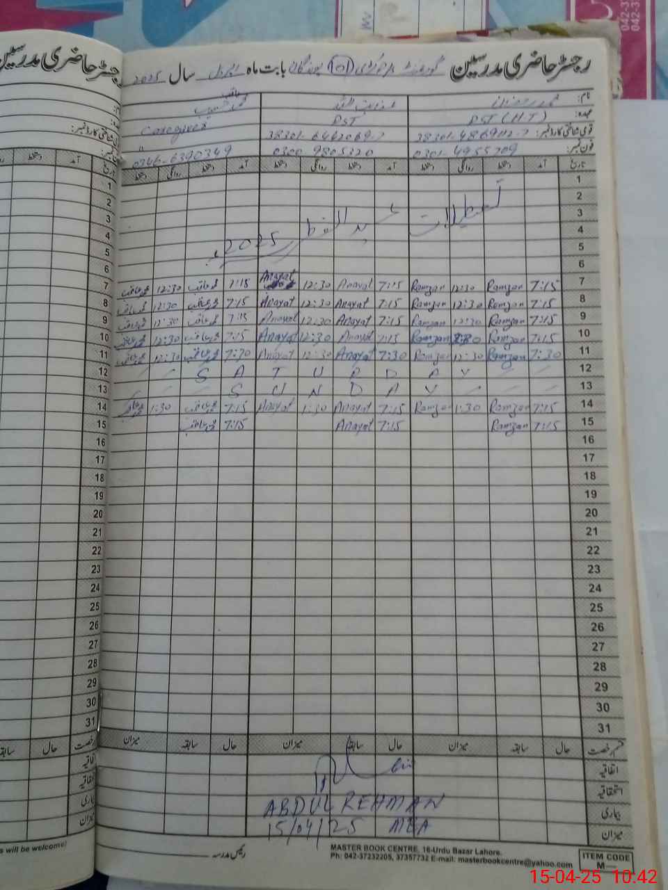 | CNIC | Full Name | Designation | R/C | Absence During Last Calender Month |
