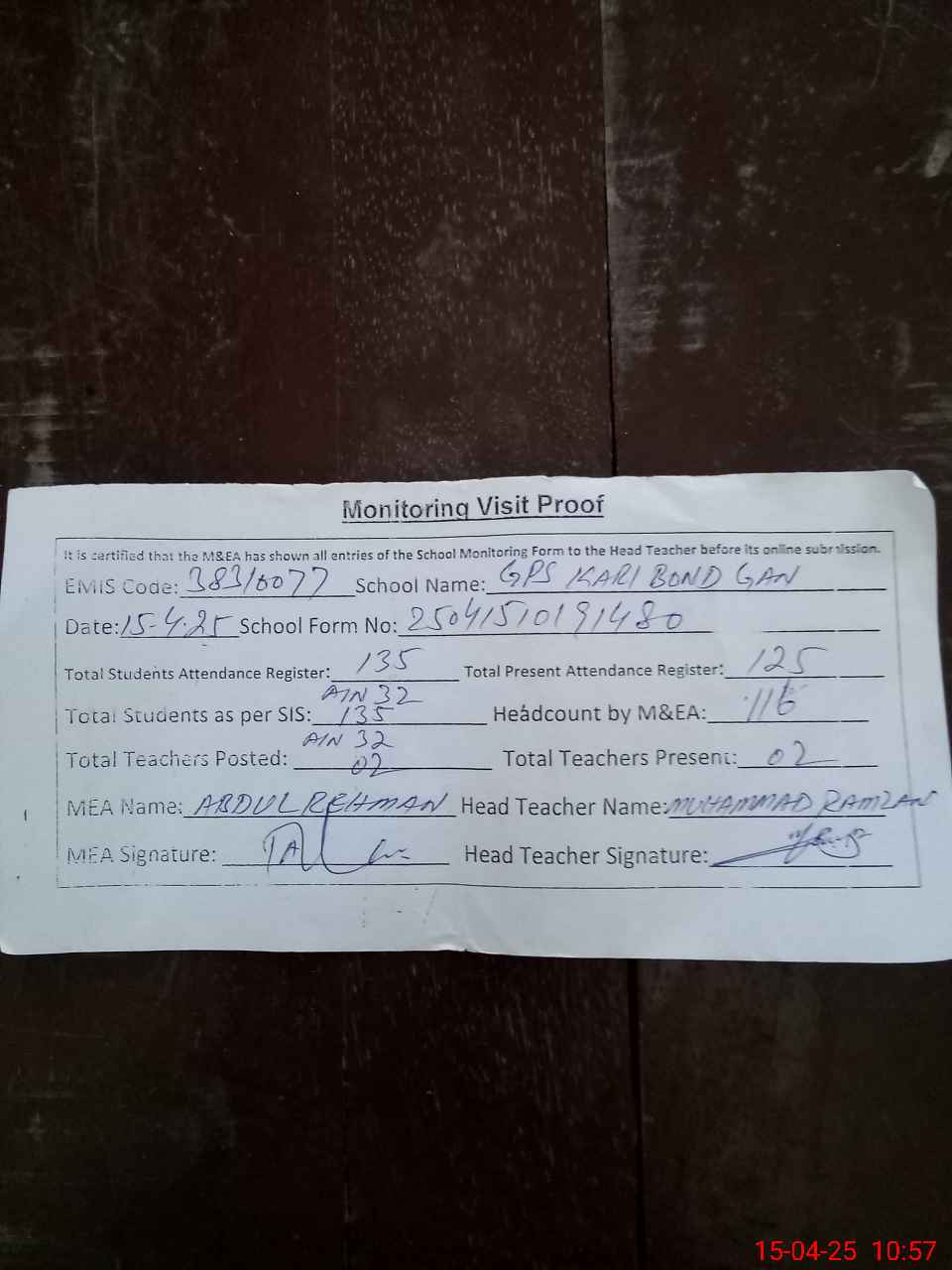| Attendance Register | Head Teacher | MEA with School | Visit Proof |