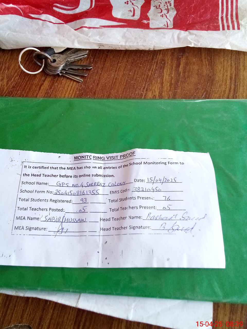 | Attendance Register | Head Teacher | MEA with School | Visit Proof |
