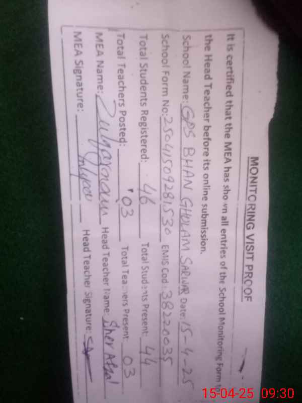 | EMIS Code: 38220035 | Name of School: GPS BHAN GHULAM SARWAR | |||