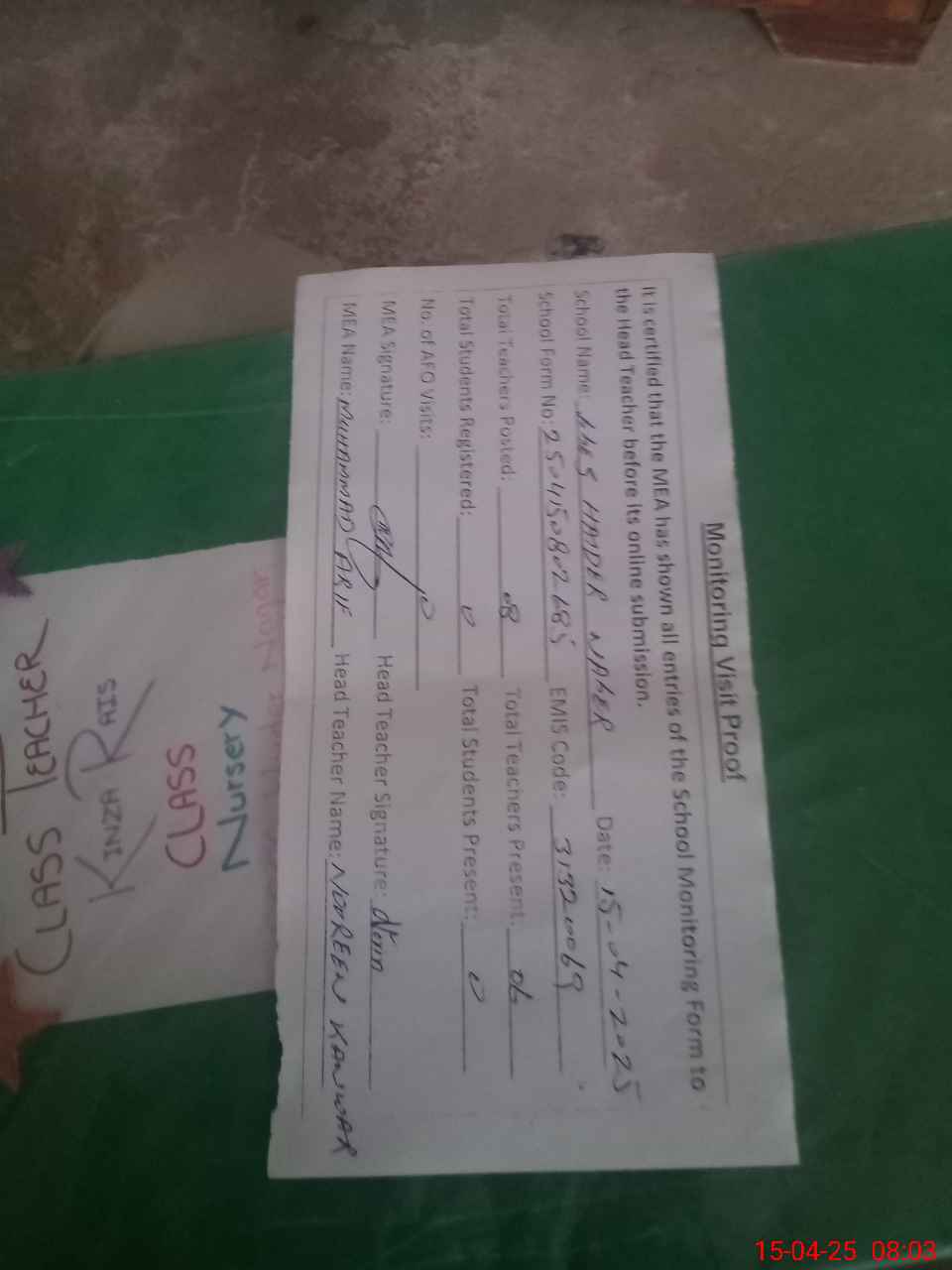 | Attendance Register | Head Teacher | MEA with School | Visit Proof |