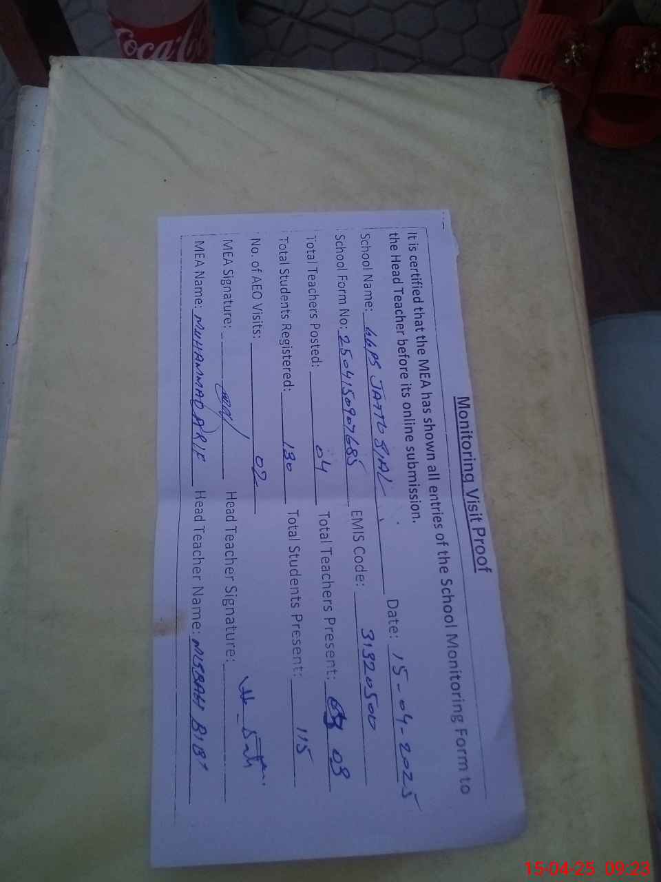 | Attendance Register | Head Teacher | MEA with School | Visit Proof |