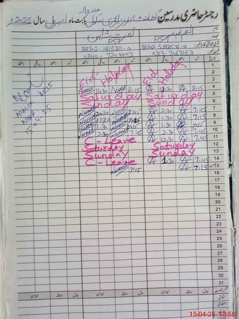 | CNIC | Full Name | Designation | R/C | Absence During Last Calender Month |