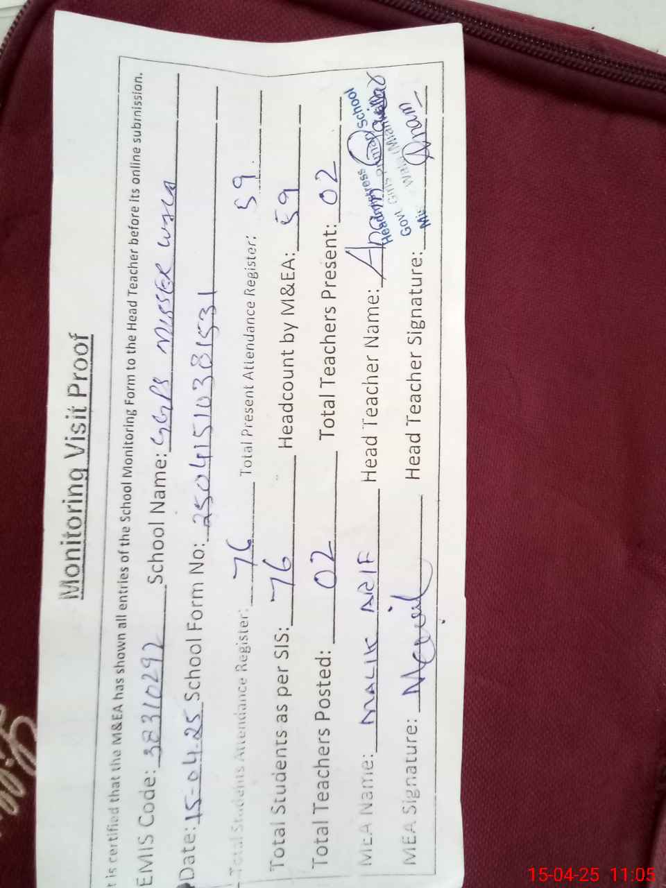| Attendance Register | Head Teacher | MEA with School | Visit Proof |