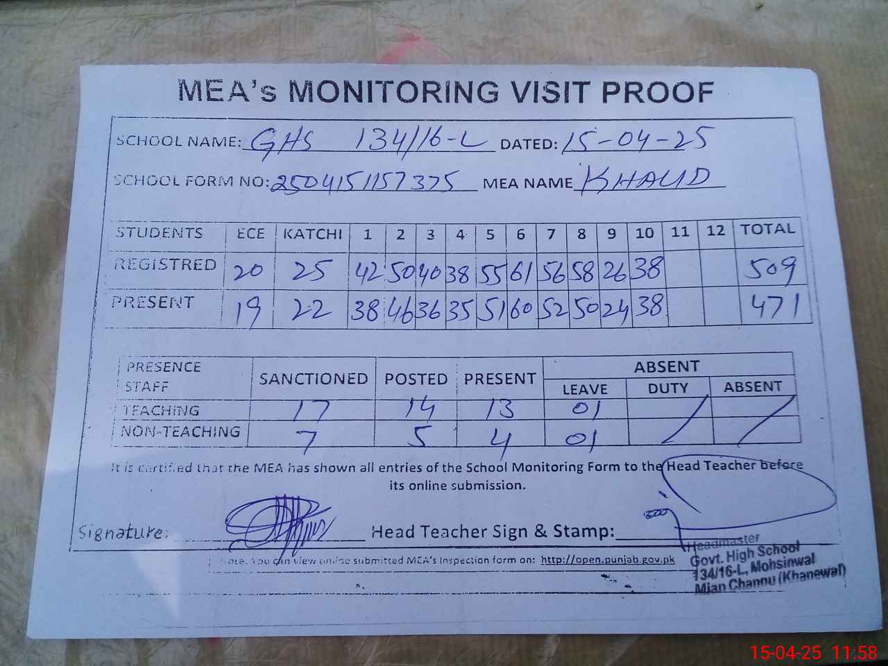 | Attendance Register | Head Teacher | MEA with School | Visit Proof |