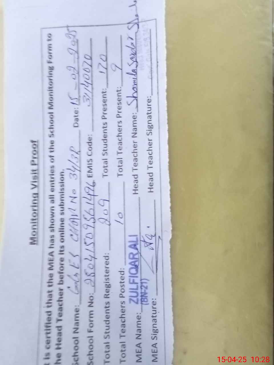 | Attendance Register | Head Teacher | MEA with School | Visit Proof |