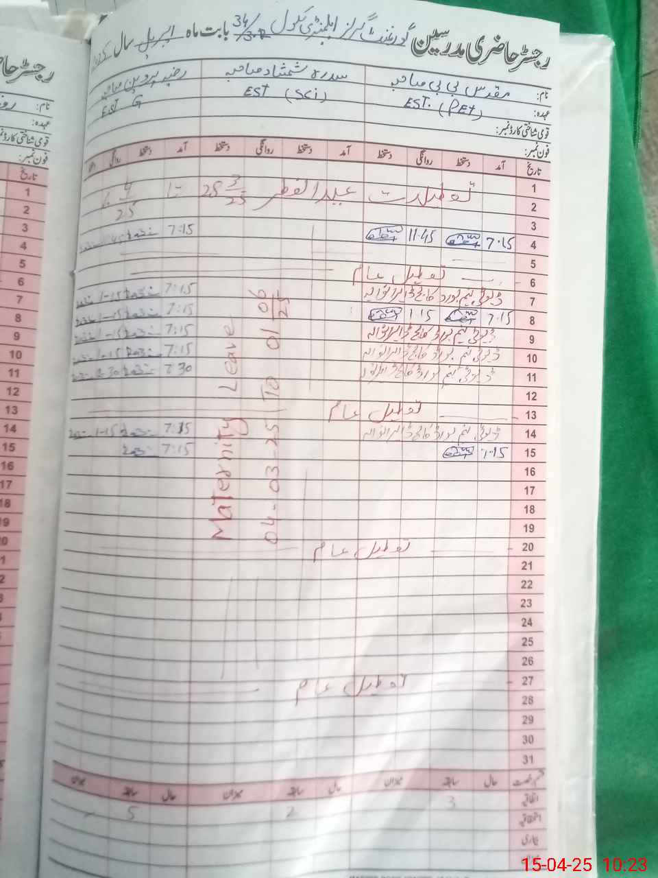 | Leave | Duty | Absent | Maternity | Medical | Ex- Pak |