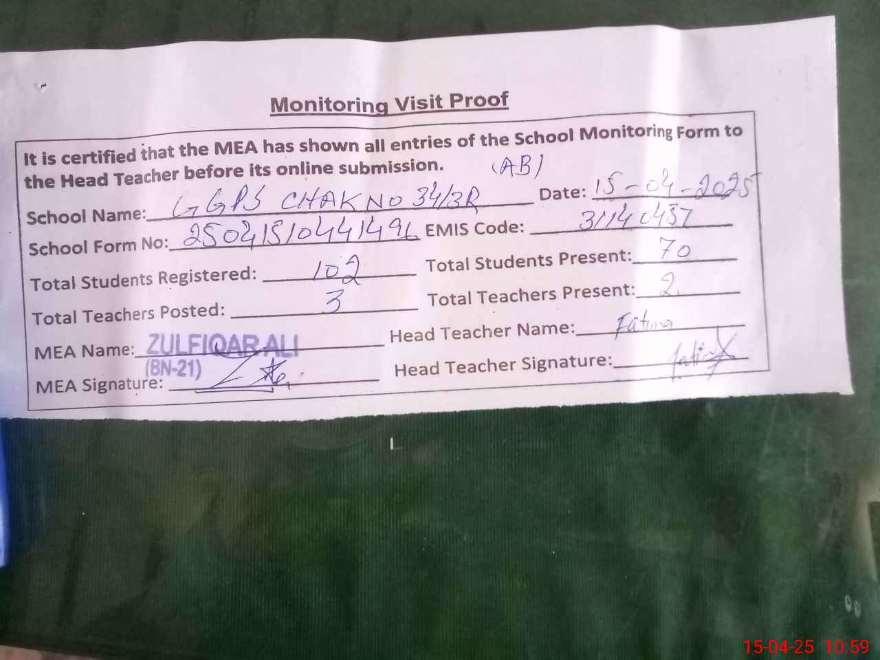 | Attendance Register | Head Teacher | MEA with School | Visit Proof |