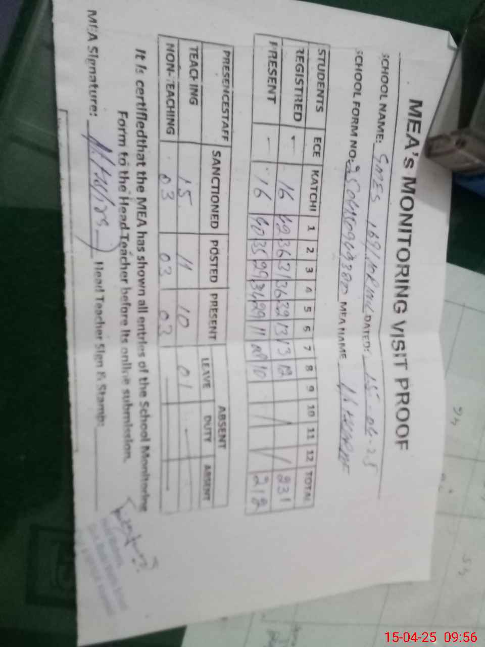 | Attendance Register | Head Teacher | MEA with School | Visit Proof |
