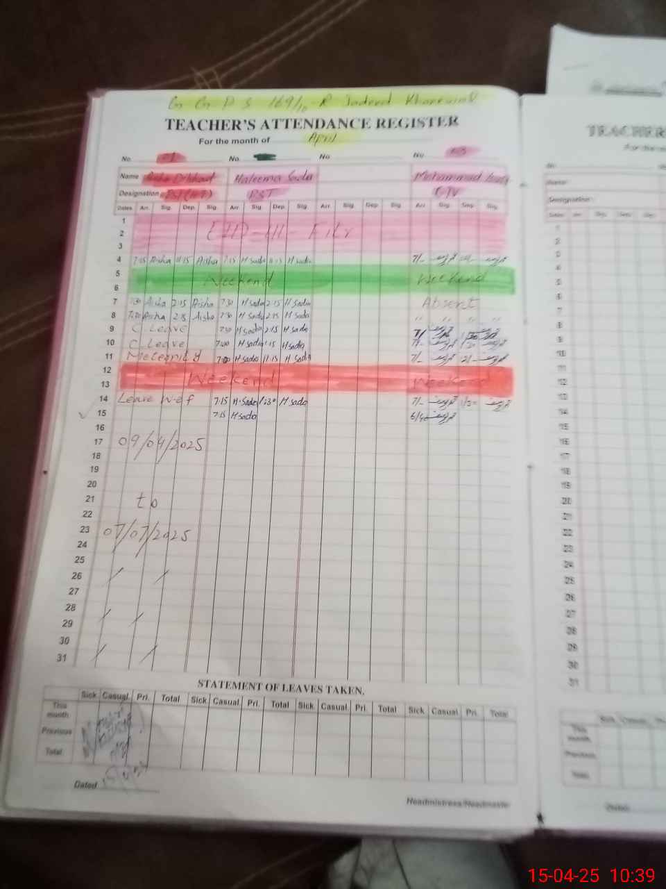 | Leave | Duty | Absent | Maternity | Medical | Ex- Pak |