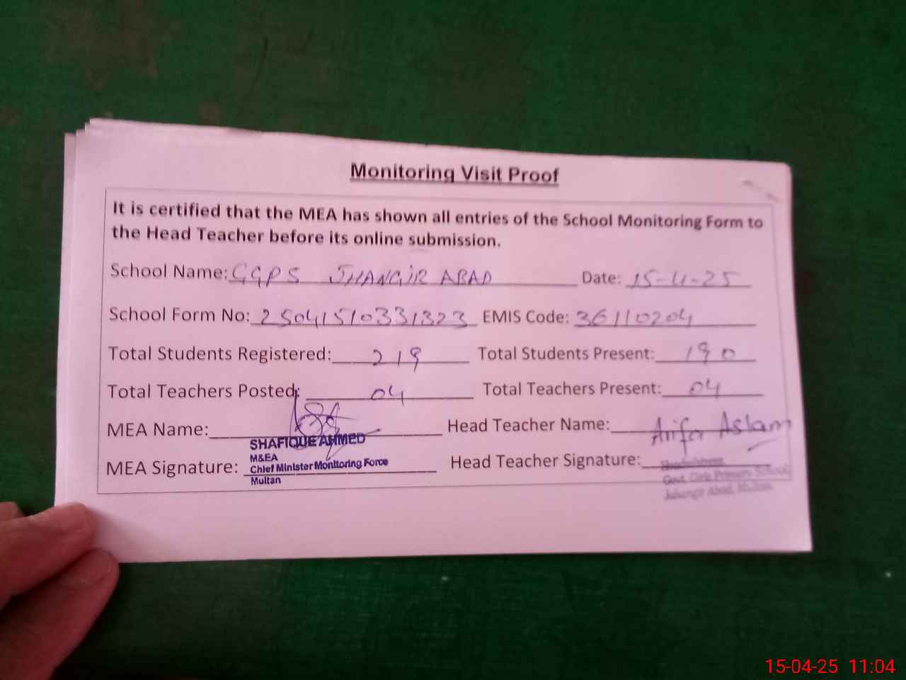 | Attendance Register | Head Teacher | MEA with School | Visit Proof |